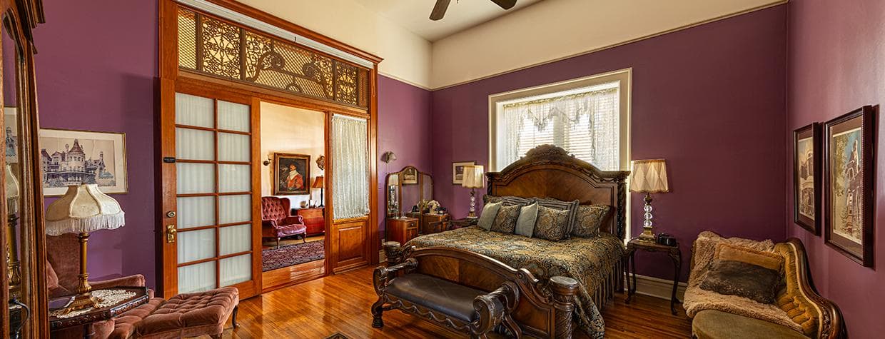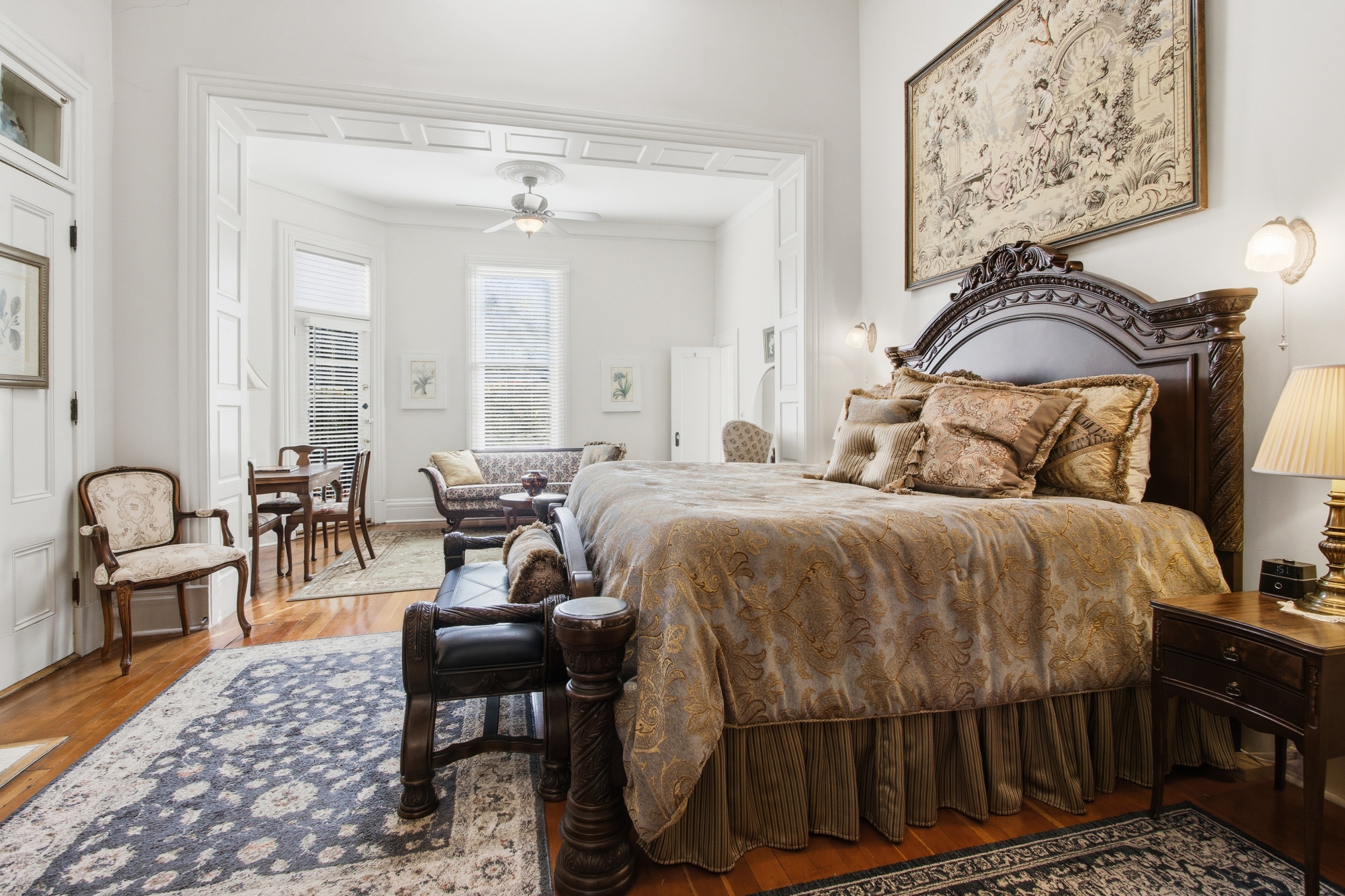 Experience the pinnacle of historic grandeur in this 1,100-square-foot sanctuary. By combining the Sydney Marie and Ryan Patrick suites, guests enjoy a sprawling four-room layout that served as the original law office of Judge Blenman and entertainment room with original fireplace. This expansive retreat is defined by its soaring 11-foot ceilings, hand-carved architectural details, and direct access to the estate's lush botanical gardens and pool with Jacuzzi spa.