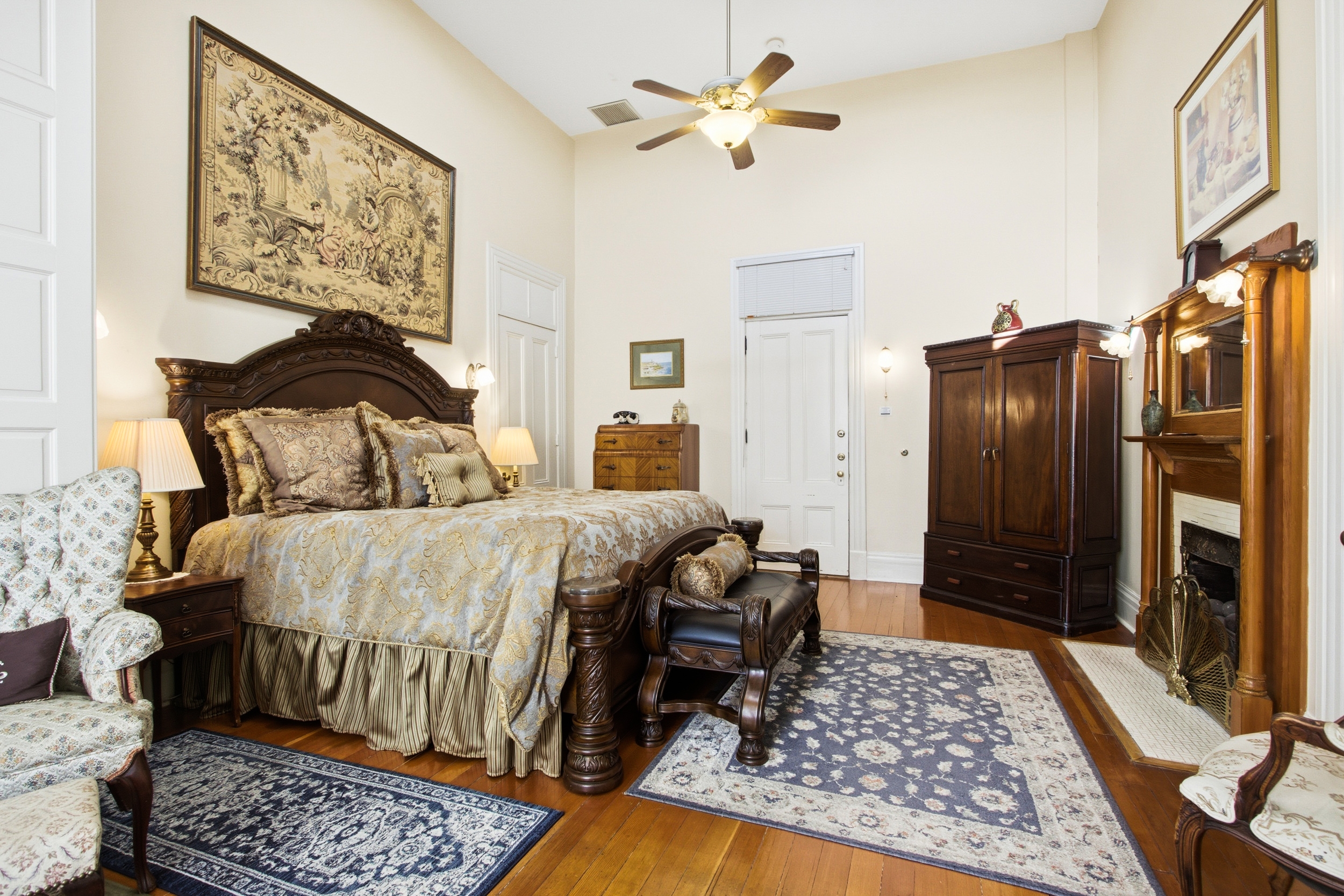 The adjoining wing elevates the experience with 11-foot ceilings and clerestory windows that bathe the smooth white plaster walls in soft morning light. Here, a second bedroom offers a luxurious high-back king bed positioned perfectly to view a charming antique brass fireplace from your bedside. A second formal living area features a hand-carved antique 19th-century Federal sofa and an expandable dining table, perfect for morning coffee or a private catered dinner.