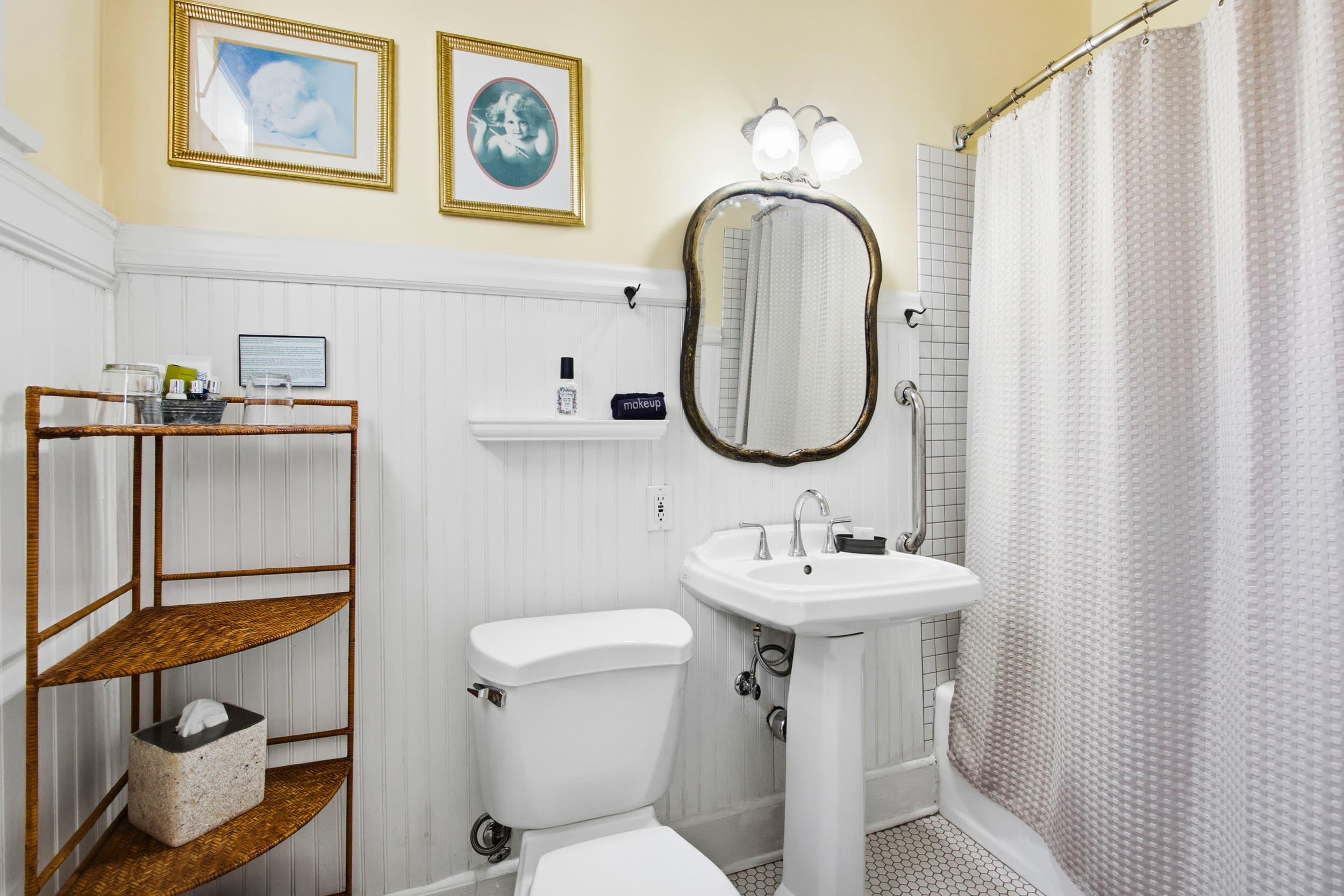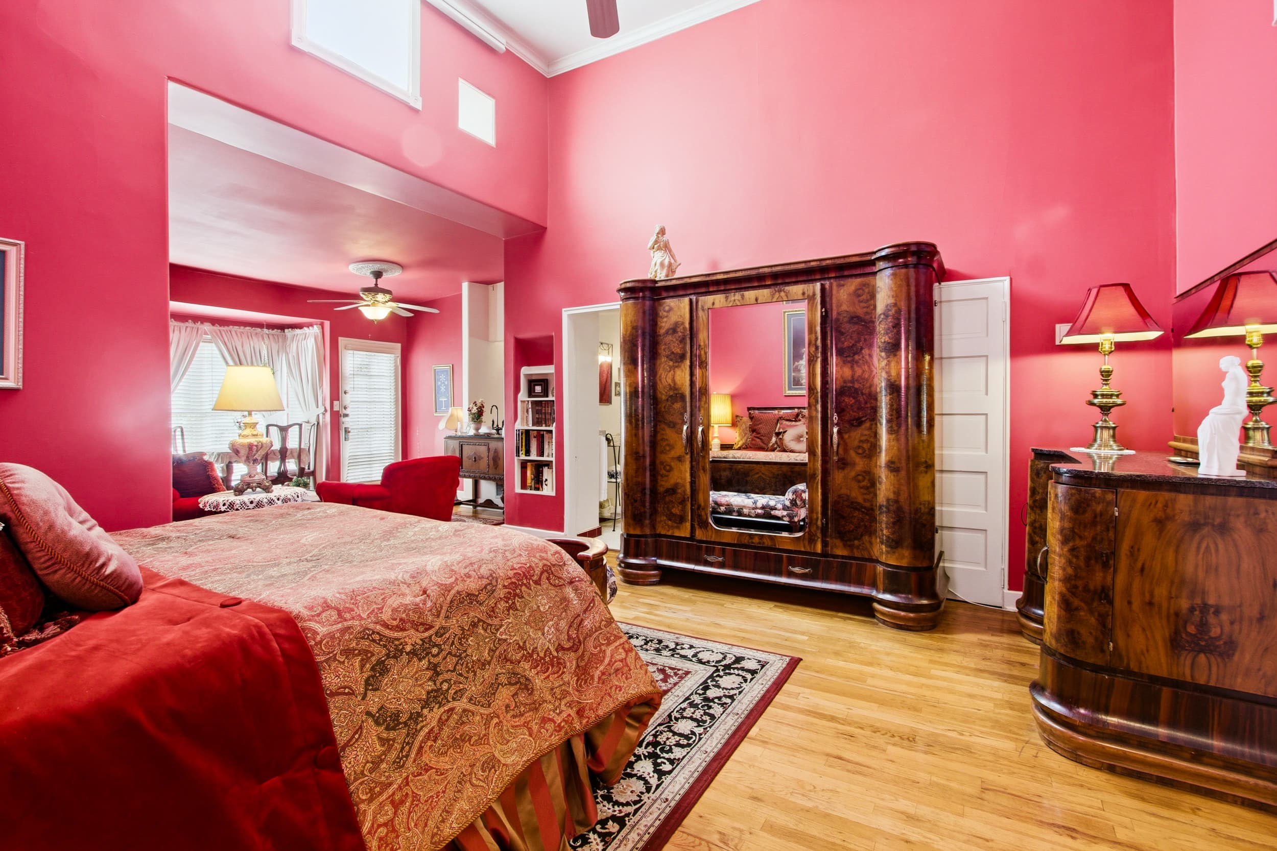 The heart of the suite is a master bedroom featuring a stunning six-piece, burled maple Art Nouveau bedroom set. Beyond the queen-sized sleeping quarters, a spacious living area invites relaxation with red suede furnishings and a sunny bay window overlooking a fragrant lemon verbena hedge - a favorite haunt for local butterflies and hummingbirds. Unique to this wing is an antique wood vanity converted into a wet bar, which sits adjacent to a private, two-person Jacuzzi tub for the ultimate evening wind-down.