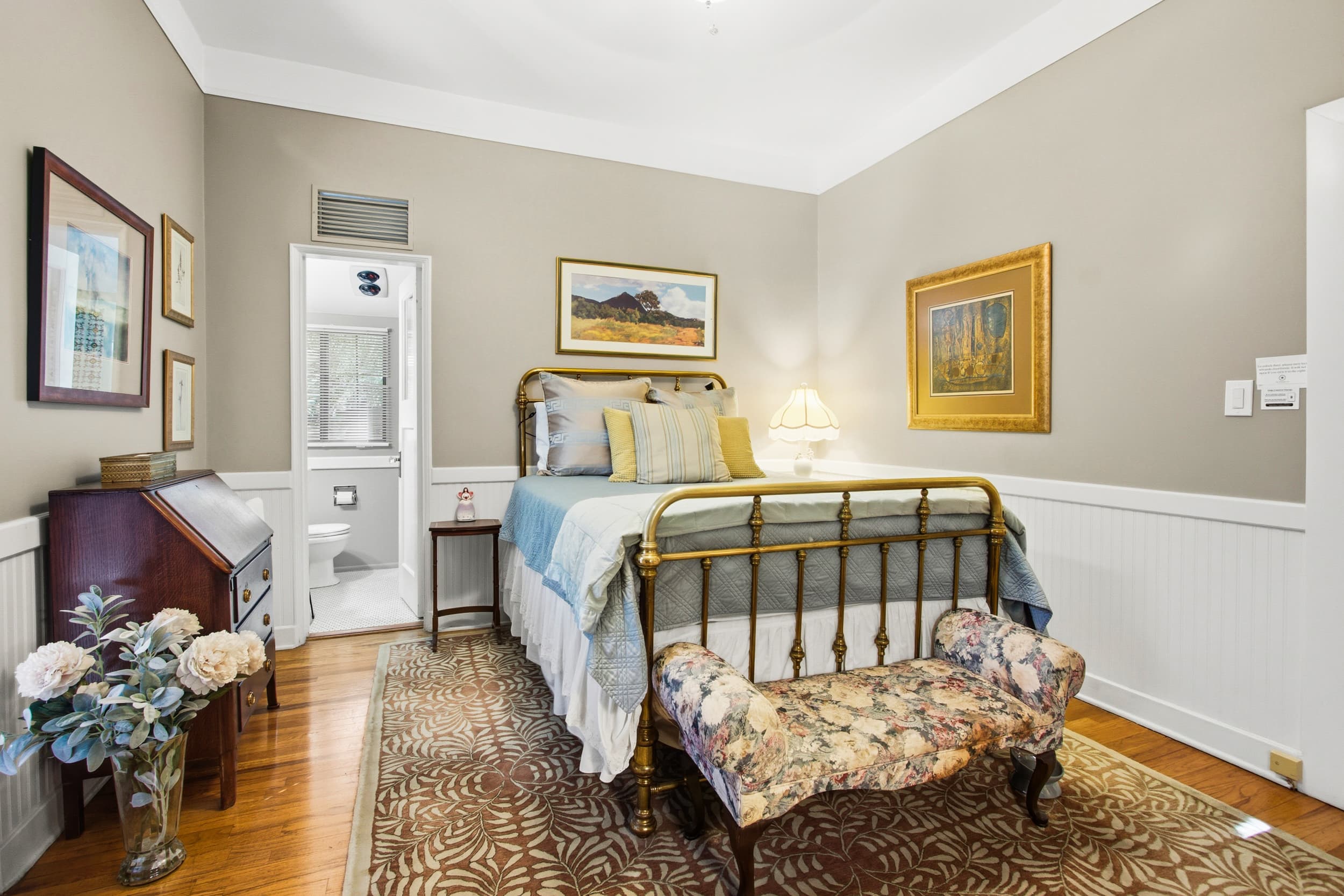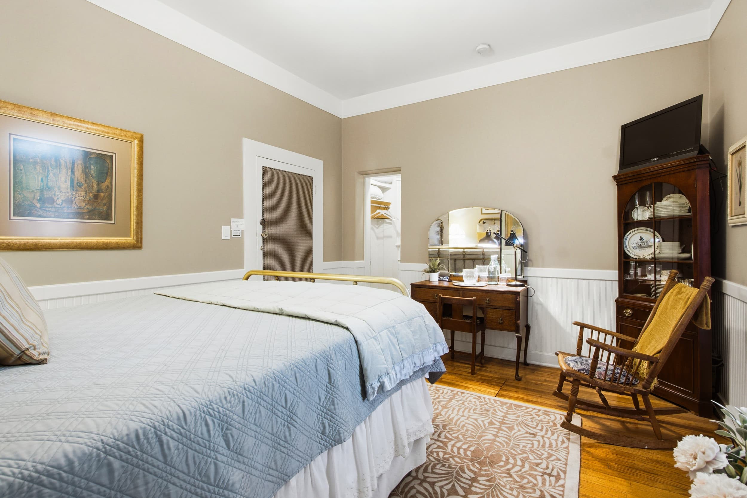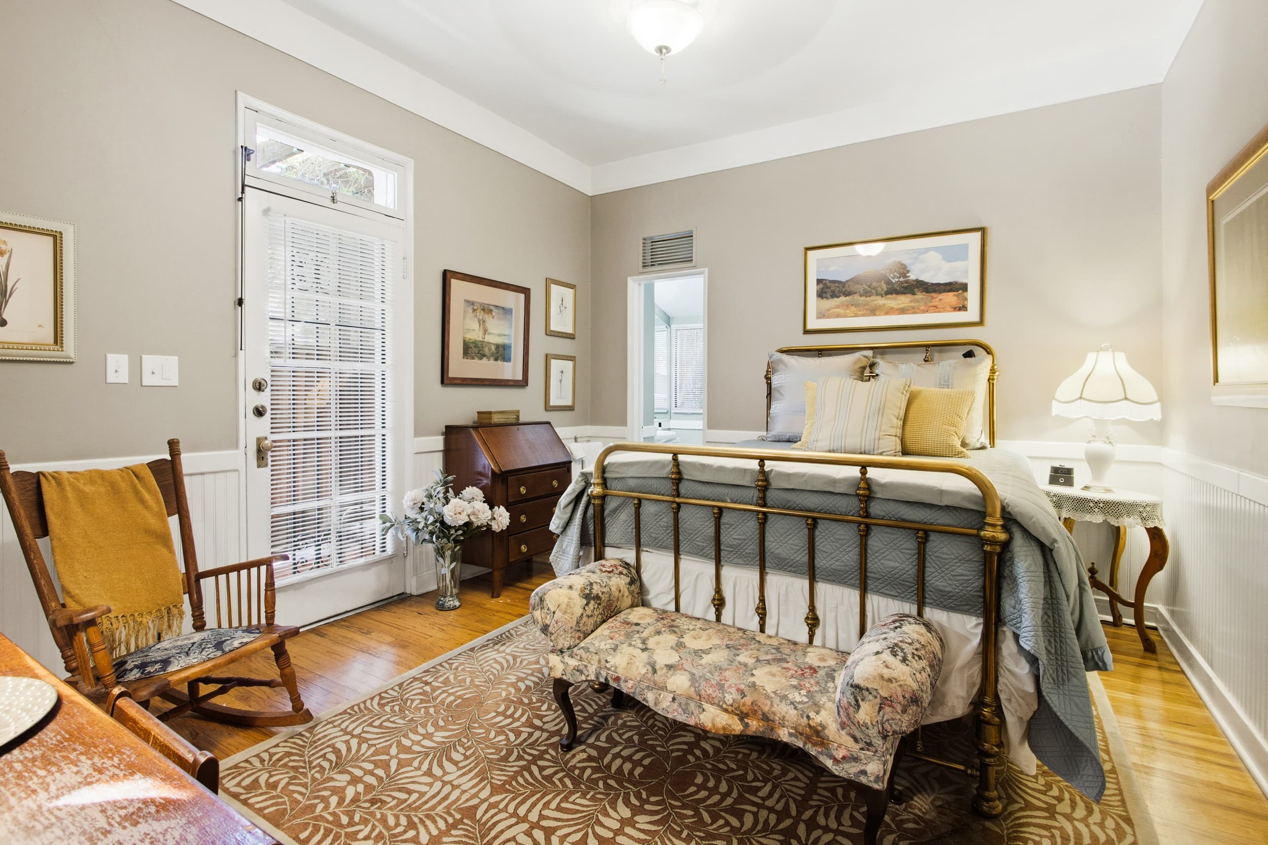 Furnished with a queen bed, antique pull-down desk & mirrored dressing table, this single room is cozy yet comfortable This room features its own outdoor space for relaxing. The private bath features a large window, providing natural light & a tiled shower. Envisioned as "the Innkeeper's suite" where guests may check in to be close to the action of making breakfasts with their hosts, the room remains quiet and removed off the kitchen for relaxed getaways.