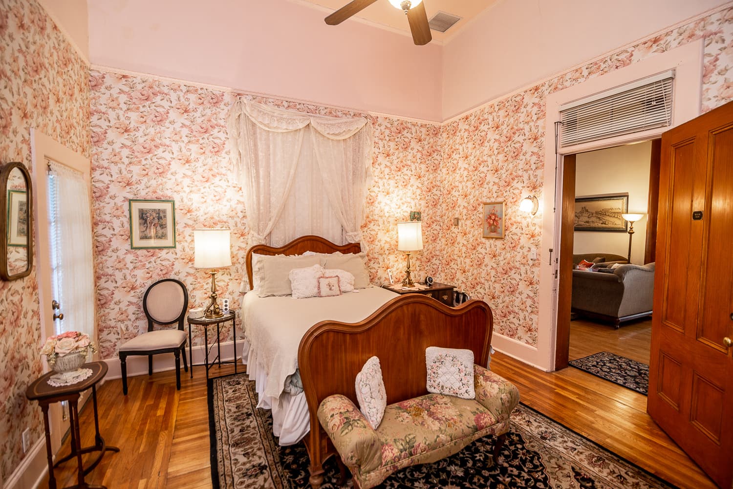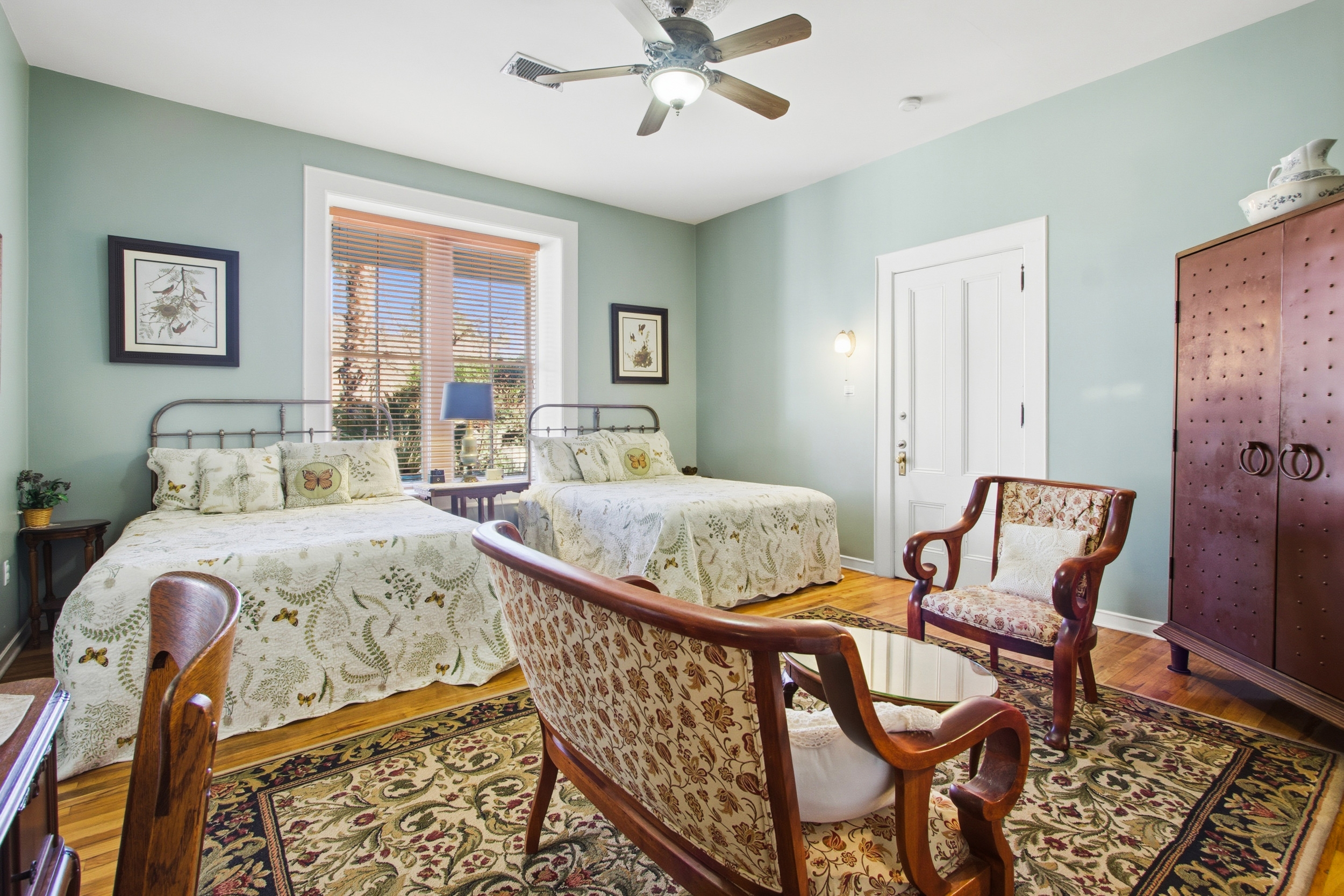 Relax in the lovely, serene, sea-green Sara Page Suite. This spacious accommodation sleeps 5 persons with 2 queen beds and one twin in the day room. A private access to the front porch leads one to relax and enjoy their morning coffee or meander along the garden path that leads to the swimming pool and spa. The most popular features of this beautifully restored suite are the sitting area in the main room, the en-suite bathroom with original clawfoot tub, and it can be adjoined to the Nick Anthony Room as an additional family room, grandparent suite, or if you're traveling with additional family or friends!